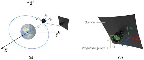 (a) Definition of the relative motion in local vertical, local horizontal (LVLH) coordinate frame (, Earth-centered inertial (ECI) coordinate frame; , position vector of the chief satellite from the center of the Earth; , LVLH coordinate frame; r, relative motion from chief to deputy). (b) The occulter and the propulsion system of the deputy satellite in the body frame.
