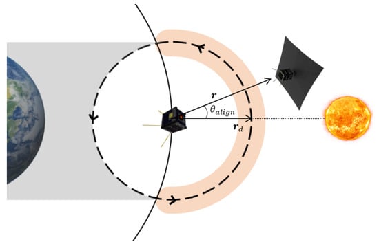 The occulter must maintain a configuration with a nominal separation of 40 m from the observation target, the Sun, because the focal length of the optical camera is designed to be 40 m. Alignment must be performed during daylight, which has less than one orbital period. Therefore, the relative position, r, must be controlled to the desired trajectory, , during the shaded daylight period (Figure 3). The control accuracy requirement is located within 3 m for each axis at the nominal position. This requirement was designed considering the size of the solar corona and the performance of the detector. Since the thrust system has only two degrees of freedom, it is impossible to fire the thrust in the direction of the occulter, making it impossible to control the relative distance. The requirements are divided into three groups: fine requirement, coarse requirement (1), and coarse requirement (2), as shown in Table 1. The most stringent requirement for fine alignment must be met to obtain an ideal depiction of the solar corona. Even if the relative distance offset is substantial, the solar corona can still be detected if the alignment angle is less than 7.5°. Coarse requirements (1) and (2) are defined as relative distance errors of 5 and 10 m, respectively, with an alignment angle under 7.5°. If these requirements are accomplished, the mission will be successful and the solar corona will be able to be obtained. The more detailed derivation of the mission requirement associated with the celestial object and payload is suggested in [35].