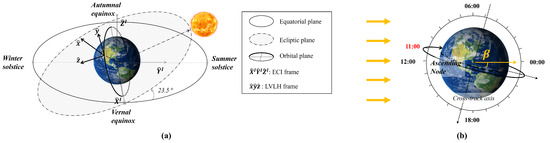 (a) The ecliptic and orbital plane in the inertial frame. (b) The local time of ascending nodes and angle of sun-synchronous orbit.