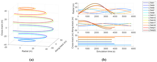 Reference trajectory for the IAH according to the LTAN at the vernal equinox: (a) Reference trajectory in LVLH frame. (b) Reference trajectory vs. orbital period.