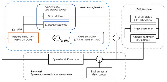 The CubeSat was designed based on the 1U standard of 10 cm × 10 cm × 10 cm and has a very narrow gap between the sensor and other components. In such a configuration, the concurrent operation of any hardware increases sensor noise and degrades the estimation results. By separating the estimation and control intervals, the actuator should not be activated during attitude estimation. According to [38], when the attitude is estimated using the 2U satellite’s fine sun sensor the error converges within 2–3 s. The sampling rate of the orbit control input was set to 0.2 Hz and the attitude was estimated 2 s prior to sampling the thrust vector and then controlled for 3 s immediately after the sampling. The attitude observation data for the estimation and control torque were sampled at 1 Hz. When tracking the thrust vector for orbital maneuvering, the reference angular velocity is zero, and the current attitude does not change significantly if torque is not applied during the estimation interval. However, the relative velocity is not zero during relative orbit control; therefore, the zero-control input causes the deputy to drift away from the chief. Therefore, the thrust must be fired continuously, while the attitude is adjusted from its current state to the desired state.
