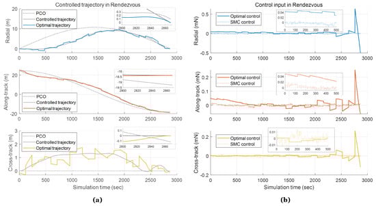 (a) Controlled and reference trajectory and (b) control input of rendezvous described in the LVLH frame.