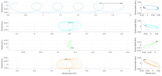 Multiple formation flight techniques are required to achieve the ultimate goal of the CANYVAL-C mission and the IAH. The relative orbit control for this mission is chronologically shown in Figure 2. After the launch of the two satellites, during the Launch and Early Orbit Phase the satellites will be separated by thousands of kilometers owing to orbital perturbations during antenna deployment, hardware commissioning, angular velocity stabilization, data transmission and reception, and so on. When the relative distance between the two satellites is reduced to a few kilometers, their orbits can be described as a relative motion. Drift recovery and station-keeping (DRSK) regulates the satellite’s orbit using Gauss’ variational equation, enabling the deputy satellite to stop within 2 km of the relative distance from the chief satellite [36]. This study only deals with the relative orbit control algorithms immediately after DRSK.