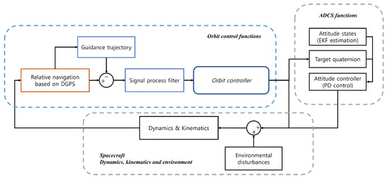 The global navigation satellite system (GNSS)-based orbit estimation is performed autonomously onboard [37]. The orbital states processed from the GNSS receiver were used as the absolute orbit determination results and for the coarse relative navigation mode by simple subtraction. When a precise navigation result is required, it is determined using the differential global positioning system (DGPS) algorithm from the GNSS raw data. The requirements for the navigation subsystem are listed in Table 4.