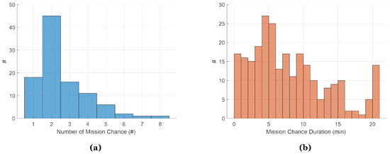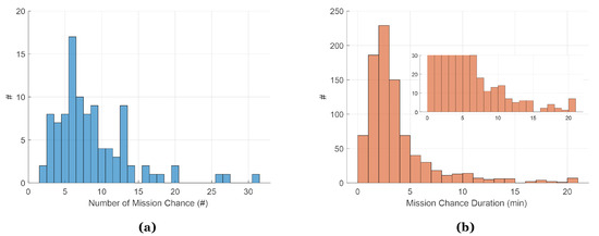 The DADC was simulated with 100 samples over a period of two months to assess the number and duration of mission successes (Figure 11). The total number of mission chances must be at least one to complete the mission scenario. As a consequence of the simulation, all the cases had at least two mission opportunities, with the majority having six. When the mission chance has a maximum value of 31, the control performance is outstanding, even when the error is considered, resulting in an extensive period of satisfying the condition (1) given in Table 7. Owing to condition (2) in Table 7, the mission chance appears discontinuously and regularly over several orbital periods during this time. The duration of the mission chance is determined by the relative orbit phase angle, which affects the amount of time before sunrise, and the drift rate, which is the amount of time it takes for the along-track position to change by 10 m and shows an average performance of 3.69 min.