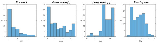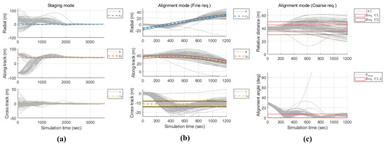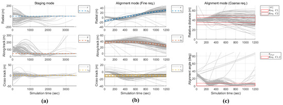 As a consequence of the Monte Carlo simulation, the random initial states that satisfy Table 7 converge to the desired trajectory within the limited operation time in the staging mode (Figure 12a). The relative error states in the radial and cross-track directions are controlled in the alignment mode, and the states cannot be perfectly controlled because of the restricted degrees of freedom of the thruster (Figure 12b). One sample in Figure 12c shows the deviation in the alignment angle, and it is the failure case of the coarse requirement (2) in Table 8. Comparing the alignment times of the three requirements (Table 1), the alignment time and success probability are the greatest for the coarse requirement (2), coarse requirement (1), and fine requirement (Figure 13 and Table 8). This indicates a 99% chance of success based on coarse requirement (2). The probability of success is 99% based on coarse requirement (2), whereas the probability of success of the fine requirement is remarkably low at 75%. This is because this satellite has a two-degrees-of-freedom propulsion system; therefore, if it orients toward the Sun in the alignment mode the alignment angle is well controlled, but the relative distance is difficult to control. The average impulse consumption is 3.41 Ns, with an average of 2.38 Ns in staging mode and 1.02 Ns in alignment mode (Table 9). Because the staging mode is 40 to 60 min and the alignment mode is 20 min, it exhibits a comparable level of impulse per time.