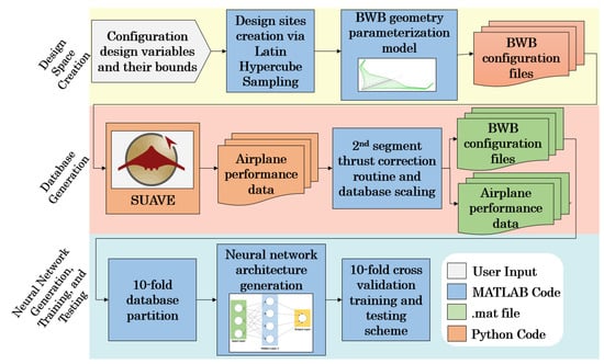 The outline of the computational approach, along with what programming languages are used, is illustrated in Figure 1 (The second-segment thrust correction process is explained in Section 2.1.2). First, a baseline BWB vehicle is used to construct a configuration parametrization model. Then, design parameters are varied via a Latin-hypercube sampling scheme. The geometry parametrization model is then used to define a number of new, unique BWB configurations. These configurations are assessed using a physics-informed, Level-0 airplane performance assessment tool. Following this step, a database is created containing design and performance data for each configuration. Numerical scaling is then performed on the database, and different neural network models are generated, each with its own unique architecture. Next, the scaled database is equally partitioned, where different portions are used to train and test the neural network models in a K-fold cross-validation scheme. Here, the neural networks are trained such that their inputs are BWB performance data and their targets are corresponding BWB configuration design parameter values, thus lending themselves towards the inverse-design objective.