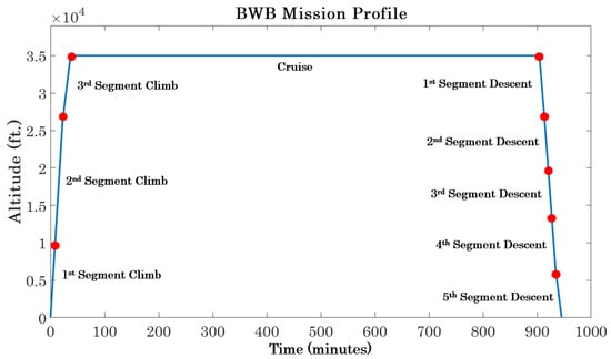 These configuration files are then run through SUAVE’s performance analysis routines, which assess every BWB configuration through the same mission constraints, and for that matter, the same mission flight profile. This flight profile represents a typical long-range, transport category, Part 25 mission with constraints on climb and descent gradients, rate of climbs and descents, speeds for different segments, and altitude restrictions [54]. The 6500 nautical mile mission is composed of first, second, and third climb segments; a cruise segment; and first, second, third, fourth, and fifth descent segments. The flight profile is visualized in Figure 8. The 6500 nautical mile range was chosen as this represents a notional, long-range mission that a vehicle similar to what the BWB450 may routinely fly in-service.