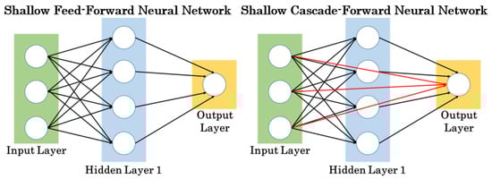 For this study, the authors investigated shallow ANNs of two different types and of varied architectures. Shallow ANNs are characterized by being composed of only one hidden layer. Typically, shallow neural networks are used to better understand the feasibility of deploying machine learning models for a problem of interest. They are relatively simple, inexpensive models to develop, in terms of computational resources required, and often serve as better surrogate models than other comparatively more complex neural network architectures for problems not involving image or video processing. Theoretically, a shallow ANN with enough neurons in the hidden layer can adequately capture complex features of a database, such as non-linearity and multi-dimensionality [58]. Within the subset of shallow ANNs, two were selected for this study—feed-forward and cascade-forward neural networks. A feed-forward neural network is considered one of the simplest neural network architectures in that each neuron in the input layer is mapped, or linked, to every neuron in the hidden, which is then mapped to every neuron in the output layer. Compared to this architecture, a cascade-forwards neural network has an additional mapping from each neuron in the input layer directly to every neuron in the output layer. This type of ANN has provided favorable predictive accuracy in scenarios involving time-series data [9]. Figure 10 illustrates the architectures for both shallow feed-forward and shallow cascade-forward ANNs. Within each model type, the number of neurons in the hidden layer, , was varied from 1 to 10 to better understand predictive accuracy sensitivity as it relates to the number of neurons. Increasing the number of neurons can impact training time and computational cost—central processing unit (CPU) speed and random access memory (RAM) usage. The trade-off, however, is the potential for higher predictive accuracy.
