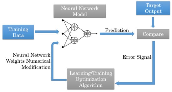 After neural network models have been architected, training can commence. The training scheme employed was supervised learning as it involved training data, and , that is labeled, and each input corresponds to one specific set of outputs [59]. The intent of training is to allow the neural network to “learn” features of the data such that it can predict output values when provided inputs. In the process of doing so, weight values are numerically adjusted to reduce the error between predicted and target values. Figure 11 provides an overview of this process. This involves passing input and output data in its entirety, iteratively through the neural network. This is referred to as an epoch—one complete pass of data to be learned by a neural network.