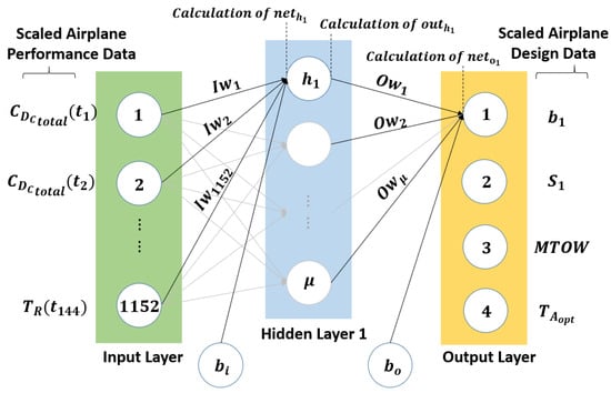 With regard to the input and output layers, the number of neurons in each is dependent on the dimensionality of the training database. In this case, since the goal is to develop a neural network suitable for inverse aircraft design, the input for training is BWB performance data, namely , while the output is corresponding BWB configuration data, i.e., . The dimensionality of is 30,000 × 1152, which implies that each BWB configuration is characterized by 1152 vehicle performance data points—composed of 8 individual performance parameters. For this reason, the input layer is composed of 1152 neurons, where each neuron represents an individual performance data point. For example, the second neuron in the input layer represents the second time step for . Meanwhile, since the dimensionality of is 30,000 × 4, this dictates that the output layer contains 4 neurons, where each one represents a different performance parameter. For example, the first neuron in the output layer represents for a BWB configuration.