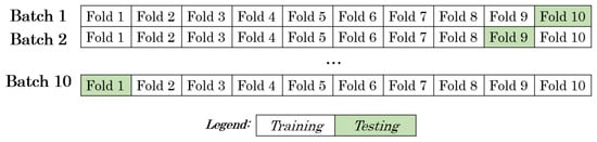 Ten-fold cross-validation training and testing matrix split by batches and fold numbers.
