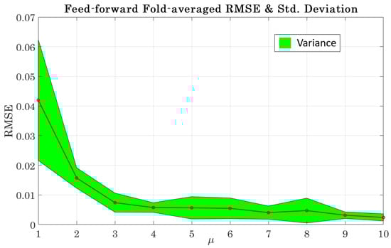 Feed-forward fold-averaged RMSE with a standard deviation overlay.