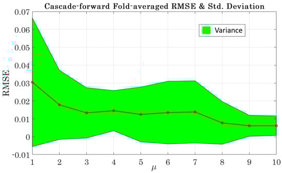 In general, feed-forward architectures yielded better predictive performance compared to cascade-forward architectures across almost all values of . Futhermore, feed-forward architectures also exhibited a significantly lower variance across all values, as shown by the green shaded region in Figure 17. On the other hand, cascade-forward neural networks are sensitive to overfitting when trained with too many training samples [72]—recall that each model is being trained with 27,000 training samples (9 folds for training, each with 3000 data points). Low error rates and high variance in predicted outputs are two indicators of overfitting, which is exhibited by cascade-forward architectures and is illustrated by the larger green shaded region in Figure 18 [73].
