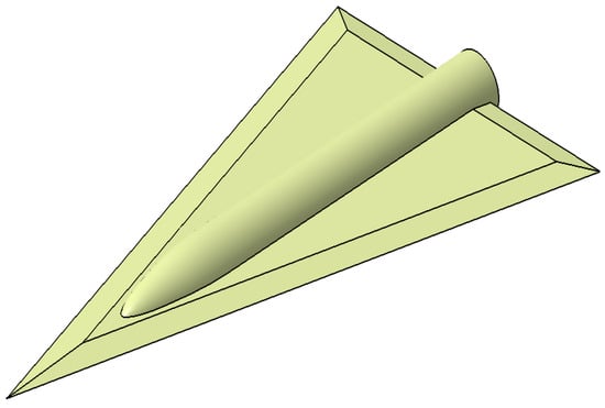The supersonic computational model selected is the delta wing–body combination from the wind tunnel test report NASA TP1878 [17]. This model features an aspect ratio of 1.65 and a sweep angle of 68°. The axial view of the model is shown in Figure 4.
