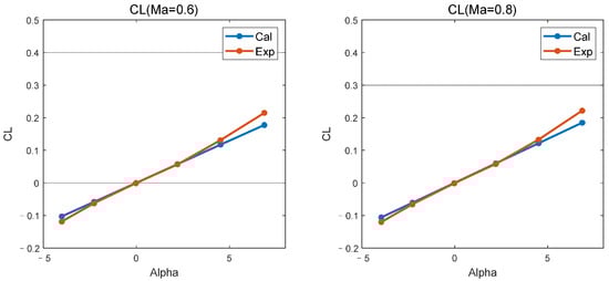 At Mach numbers 0.6 and 0.8, the comparison between computational results and wind tunnel experimental data for the variation in the lift coefficient with the angle of attack for this model is depicted in Figure 2. The computational results align with the experimental data within the range of −5 to 6 degrees angle of attack. However, due to the large sweep angle, after the angle of attack exceeds 6 degrees, localized flow separation begins to occur on the aircraft as the angle increases. The presence of nonlinear properties in the lift curve gives rise to inconsistencies between the computational results and experimental observations.