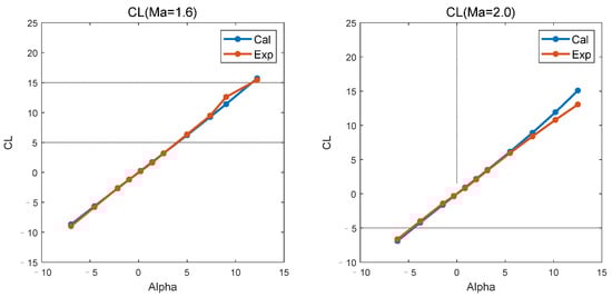 At Mach numbers 1.6 and 2.0, the comparison between computational results and wind tunnel experimental data for the variation in the lift coefficient with the angle of attack for this model is depicted in Figure 5. It is necessary to clarify that the reference area used for the test data in NASA TP1878 [17] is the cross-sectional area of the fuselage, not the wing area. This accounts for the higher values of the lift coefficient. At Mach 1.6, the computational results are broadly consistent with the experimental data. However, at Mach 2.0, when the angle of attack exceeds 8 degrees, the experimental data exhibit nonlinear characteristics, leading to certain discrepancies between the computational results and the experimental data.