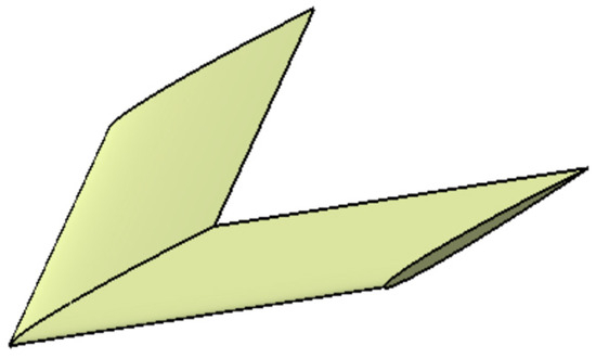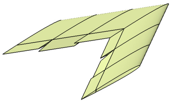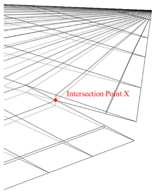 The program, based on the mesh point information of the original configuration without control surface deflection, automatically calculates the positions of the mesh points after deflection, as well as the intersection points between the deflected control surface end face and the corresponding wing end face, as represented by point X in Figure 13. It recalculates the mesh points of each wing section’s rear surface and the newly added end face according to the position of the intersection points, aiming to minimize mesh distortion. Since the mesh points shift based on the position of the intersection points, significant variations in adjacent mesh sizes may occur when the control surface deflection angles are either very large or very small. To avoid numerical issues, the program automatically calculates the sizes of the shifted meshes. In cases where the size exceeds a threshold or where there is a rapid change in adjacent mesh sizes, the mesh in that area is automatically refined, as illustrated in Figure 14 and Figure 15.