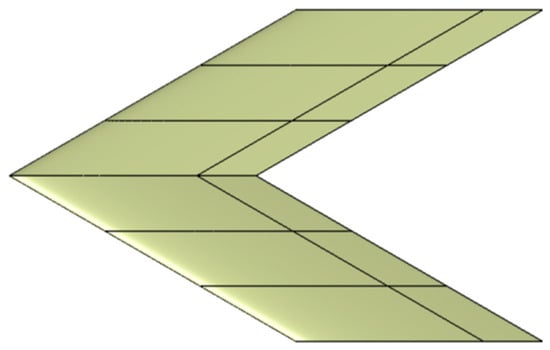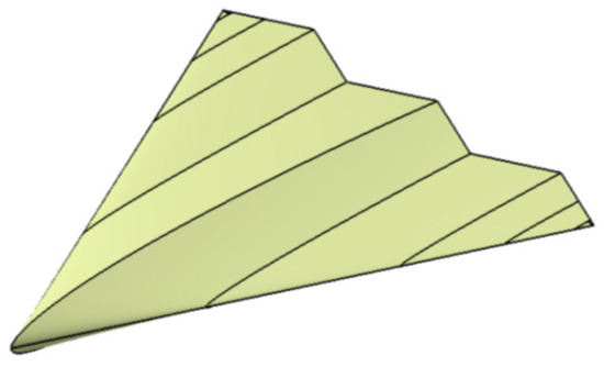 The wing model used in this part is selected from the wind tunnel test report NACA TN No.1581 [19], and features an aspect ratio of 1.34, a sweep angle of 60°, and employs the NACA 0012 airfoil. The model’s axial view is illustrated in Figure 7. The model is divided spanwise into three wing sections, with the rear part of the middle section designated as the control surface, as shown in Figure 8. With the control surface deflected downward by 10 degrees, the aerodynamic forces resulting from both the unchanged geometric configuration with added local velocity perturbations to simulate control surface deflection and the actual geometric deflection of the control surface were calculated. The comparison of lift, drag, and pitching moment for both scenarios is depicted in Figure 9. It is evident from Figure 9 that the lift and pitching moment obtained by simulating control surface deflection through the addition of velocity perturbations are consistent with the results of actual deflection, making this approach suitable for rapid assessment of an aircraft’s longitudinal trim capabilities and for a rough estimation of trim angles. However, since the integration for aerodynamic force calculation is conducted on the panels without actual panel deflection, the integral result in the x direction is slightly reduced. Furthermore, given that the drag coefficient is small, the relative difference in drag values between the two methods is somewhat more significant, rendering this simplified method unsuitable for calculating drag.
