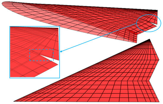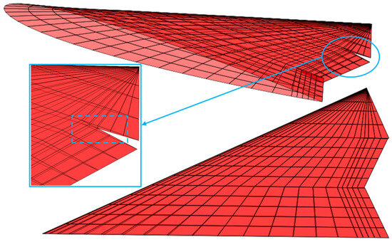 The geometric model after a 10-degree deflection of the control surface is shown in Figure 10, with the corresponding semi-model panel mesh depicted as well. Following the deflection of the control surface, it is observable that a pair of narrow end faces emerge at the positions marked by black circles, causing the end portion of the mesh to deform into narrow triangular grids, as shown in Figure 11. The airfoil used in the model is the NACA 0012, which is characterized by its lack of camber and relatively larger thickness. During the optimization process, the airfoil will continuously change, and airfoils associated with supersonic performance are generally thinner. When the airfoil has a smaller thickness and is cambered, the deformation of the grid at this location becomes more pronounced, thereby affecting the numerical stability during calculations.