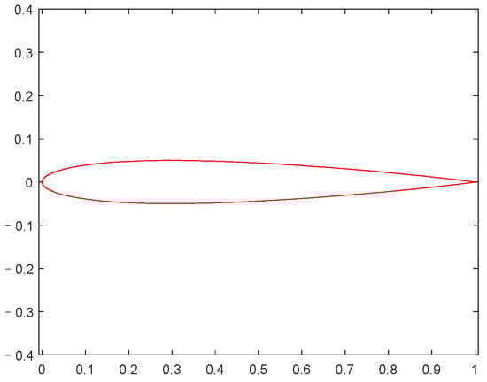 The Innovative Control Effectors (ICE) program configuration 101 [27] was selected as the baseline for optimization, as illustrated in Figure 17. This model represents a typical tailless flying wing aircraft with a large sweep angle and a low aspect ratio. The root chord length of the baseline model is 13.14 m, with the chord lengths at two transition positions being 8.169 m and 4.968 m, respectively. The wingspan is 11.42 m, with a reference area of 75.26 m2 and an average aerodynamic chord of 8.51 m. The leading-edge sweep angle is 65 degrees, and the aspect ratio is 1.73. Each section of the baseline model utilizes the same symmetrical airfoil, as depicted in Figure 18. The root airfoil parameters are represented using the IGP method, as detailed in Table 2.