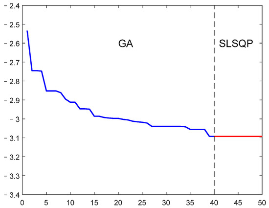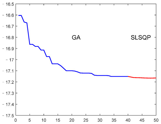 Utilizing the optimization framework outlined in Section 3, a supersonic optimization analysis was conducted for the problem defined in Section 3.5. The incoming flow Mach number was set to 1.5 at an altitude of 10,000 m. The optimal values obtained after 40 generations using the GA method were used as initial values for the SLSQP optimization algorithm. The optimal solution generated from the hybrid optimization design, in comparison to the baseline model, is presented in Table 6. The variation curve of the objective function’s optimal value over generations is depicted in Figure 22. The optimized model’s trimmed lift-to-drag ratio was 3.05, an improvement of 8.1% compared to the baseline model, and the control surface trim deflection angle was −0.72 degrees, satisfying the constraint of being less than 5 degrees.