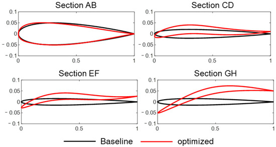 The comparison between the airfoil profiles of each section of the optimized model and the baseline model is illustrated in Figure 21. As can be observed, the camber of the airfoils in each section of the optimized model has significantly increased. This increase in camber enhances the pressure difference between the upper and lower surfaces of the airfoil, thereby augmenting lift, improving the aircraft’s longitudinal stability, and enhancing the lift-to-drag ratio. Furthermore, the negative twist in the airfoil profiles of each section progressively increases along the span, resulting in smaller angles of attack at the wingtips relative to the wing roots. This optimization in the lift distribution over the wing leads to a distribution that more closely resembles an elliptical shape. Such a design effectively delays or reduces wingtip stalls and minimizes drag caused by uneven lift distribution, thereby optimizing the lift-to-drag ratio.