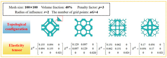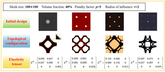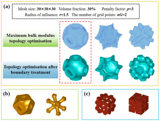 - Huang, X.; Radman, A.; Xie, Y. Topological design of microstructures of cellular materials for maximum bulk or shear modulus. Comput. Mater. Sci. 2011, 50, 1861–1870. [Google Scholar] [CrossRef]