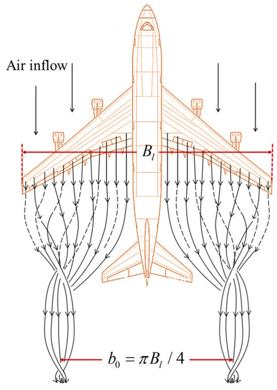 where and are the mass and the airspeed of the preceding aircraft, is the gravitational acceleration, and is the atmospheric density. The initial vortex core spacing is obtained as follows [20]: