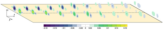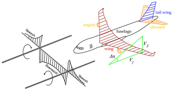 where denotes the tangential velocity of the wake vortex; and are the initial circulation of the left and right vortices, whose magnitude is equal to ; and and are the distances from a point in the flow field to the centers of the left and right vortices.