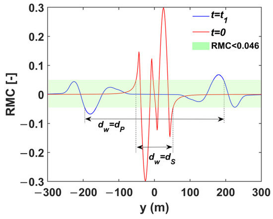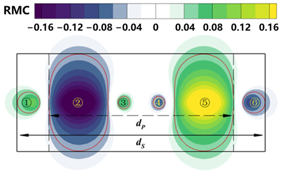 Figure 4 shows the hazard zone where the B738 encounters the initial wake of the B744 (the area within red coils 1–6, judgment criterion |RMC| = 0.046). A negative RMC in the hazard zone means that the B738 will roll clockwise if the B738 encounters the wake of the B744. Conversely, a counterclockwise roll will occur. As the wake vortex dissipates, hazard zones 3 and 4 are the first to disappear. Hazard zones 1 and 6 will exist for some time before disappearing. Hazard zones 2 and 5 will be present for longer periods of time and will disappear at the same time as the final time of the wake hazard zone [29]. is defined as the width of hazard zones 1 and 6, and is defined as the width of hazard zones 2 and 5.