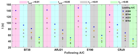 Calculations of and for hazard zone dispersion for two atmospheric turbulence conditions ( and ) were carried out and the results are shown in Figure 8 (different colored areas represent different calculation conditions). It can be concluded that, as the turbulence intensity decreases and the wake vortex dissipation rate slows down, the wake time separation increases. The lower the turbulence intensity, the smaller the separation between the distributions of and between the same preceding aircraft and different following aircraft. Taking the preceding aircraft as A388, as an example, the difference between different is within 23 s at ; at , the difference between different is within 8 s.