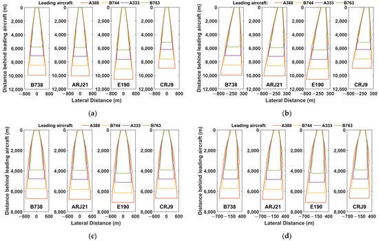 The indicates the maximum distance of the boundary of the hazard zone from the flight path of the preceding aircraft. The changes due to the influence of the crosswinds. As shown in Figure 12, the magnitude of change is greater at an atmospheric turbulence intensity of 0.01. At , the of A388–E190 decreases from 799.17 m to 125.67 m as the crosswind speed increases from –6 m/s to 6 m/s, and the of B763–B738 decreases from 415.89 m to 105.46 m. At , the of A388–E190 decreases from 664.72 m to 176.23 m as the crosswind speed increases from –6 m/s to 6 m/s, and the of B763–B738 decreases from 383.42 m to 129.61 m. The weaker the turbulence strength, the slower the wake vortex dissipates and the longer it is disturbed by crosswinds. With increasing wind speed, the continually approaches half the width of the initial hazard zone. However, the will not be equal to due to the diffusion of the wake vortex vorticity and the self-induced effect of the wake vortex [29].