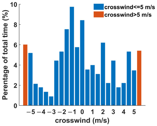 Figure 10 displays seven-day wind data for Shanghai Hongqiao International Airport, with winds blowing from runway 18L to 18R. The distance between the two runways at Hongqiao Airport is 365 m. Crosswinds perpendicular to the CSPR were extracted and counted in intervals of 0.5 m/s, providing a detailed percentage distribution from –5 m/s to 5 m/s. Wind data exceeding 5 m/s are represented in the orange area of the graph. Among the seven-day statistics, –1 m/s had the largest share at 9.73%, while 11.40% of the time periods had crosswind components greater than 5 m/s.