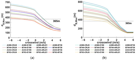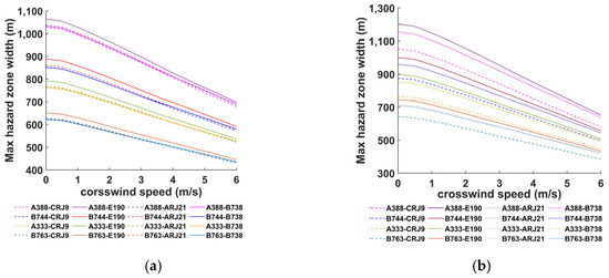 Maximum hazard zone width for crosswinds 0–6 m/s. (a) . (b) .