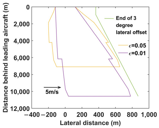 Some airports implement a 3-degree offset to the following aircraft in the PA to better avoid the wake of the preceding aircraft [10], as shown in Figure 13. Furthermore, the glide angle of the preceding aircraft is slightly lower than that of the following aircraft, i.e., it is usually taken as –0.15°. The offset angle is canceled when the following aircraft flies 0.5 nautical miles from the runway threshold. Once the preceding aircraft intercepts the glide slope and performs a general approach, the following aircraft needs to adjust its distance from the preceding aircraft according to the parameters given by the separation management system. Hence, the following aircraft will be located within the wake safety zone.