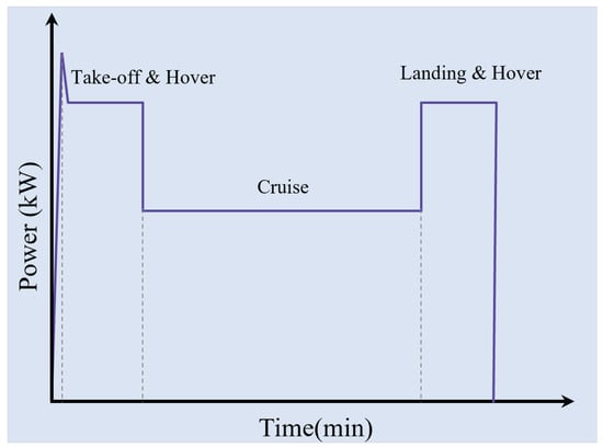 The application context of this motor is the propulsion of a multirotor aerial vehicle, with a gross take-off weight of 450 kg (). This aerial vehicle is composed of 6 propulsion chains (), including a propeller, EM, electronic speed controller (ESC), and energy storage system (ESS) that could feed several propulsion chains. Moreover, this vehicle could carry a payload of of the (roughly 100 kg), with a maximum cruising speed of 54 km/h at altitude h of 500 m. For a multirotor aerial vehicle, the power flight mission, as illustrated in Figure 1, is divided into 3 phases of take-off/hovering, cruise, and landing/hovering. Among these phases, it is remarkable that the power required during the take-off and landing phases is much higher than during the cruise phase.
