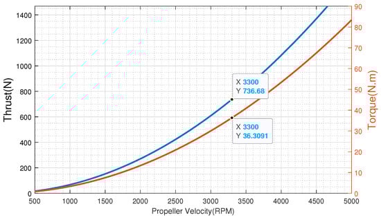 where (kg/m3), , , and N (rpm) are, respectively, air density, thrust coefficient, torque coefficient, and propeller velocity. The air density, , is determined by both the local temperature (°C) and the air pressure p, which is further determined by altitude h (m). The thrust and torque coefficients are dependent on the propeller blade airfoil shape. Their model and their approximative values are presented in []. Based on the sizing methodology presented in [], it is suggested that with a carbon fiber propeller of m and m, the developed thrust is 74 kg at a velocity of 3300 rpm. The propeller parameters and its thrust and torque in terms of the velocity are, respectively, given by Table 1 and Figure 2. It is noticeable, as shown in Figure 2, that the working motor torque is 36 N · m.