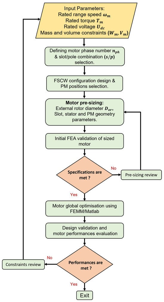 The design optimisation method presented in this paper is based on a combination of analytical and numerical optimisations design methods for OR multiphase PM electric actuators. As shown in Figure 3, this methodology offers the possibility of considering several topologies in terms of motor number of phases , the combinations, winding configuration, and positions of PM. This approach takes as input the rated range speed with the maximum torque , which is defined through the AV flight mission, the rated bus dc voltage , and constraints in terms of embedded mass and maximum volume reserved for the actuator (). It should be noted that in aircraft and airspace applications such as the one considered in this paper, the constraints in terms of mass and volume are critical and directly influence the AV performances.