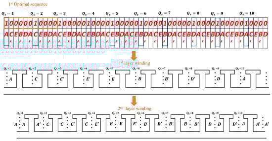 - Step 4: The conductors associated with the numbers 1 of the sequence are selected to make the first layer of winding. This allows to obtain the first layer winding. The second layer winding is obtained by reproducing and shifting the initial layer by a tooth or a slot width. Figure 4 gives the winding layout for a quarter of the machines (). The whole winding configuration is completed by an antiperiodic symmetry, as is an odd number in this case.