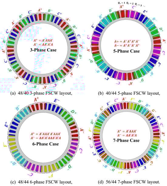 The same process is applied to other configurations, namely 3-phase , 6-phase , and 7-phase . Figure 5a–d gives their whole winding configuration, respectively.