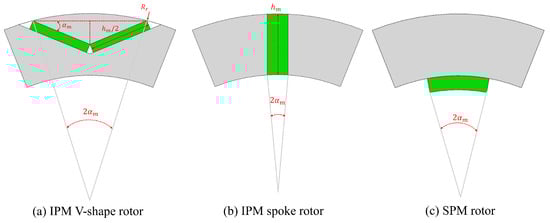 There are many configurations for installing magnets on or in the rotor. These topologies can be divided into two main categories: surface magnet (SPM) rotor and interior magnet rotor (IPM). In comparison with other topologies, the SPM rotor configuration is widely adopted as an efficient solution, due to its simple structure, and ease of manufacture; the absence of magnetic salience and reduced tooth effect minimizes torque oscillation and makes control much easier [,]. In the case of the IPM rotor, the magnets are inserted in the rotor, which makes them intrinsically well protected mechanically and magnetically [,]. Figure 6 provides the 3 PM configurations which will be considered in this paper. It is noticeable that the consideration of several PM configurations will allow us to assess their influence on EM performances, especially the motor efficiency, torque density and torque rippling.