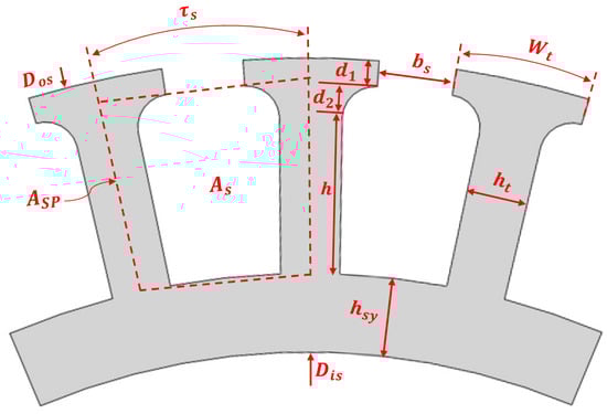 where and , as illustrated in Figure 7 are, respectively, the pole slot area, and the tooth area. The term presents the geometrical slot area. These area expressions are given by: