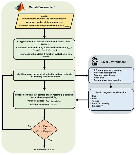 The optimisation is based on the Direct algorithm, belonging to the global non-linear constrained optimisation family. Its working principle consists of minimising a black-box objective function with a bounded normalised search space. The normalisation of search space has no influence on the algorithm convergence as the optimisation variables are bounded. Thus, the search space becomes the unit hyper-cube. DIRECT works by partitioning the unit hypercube into subrectangles with the property that the objective function has been evaluated at each rectangle’s center point. In each iteration, certain “potentially optimal” rectangles are selected for further search; these rectangles are then subdivided, and the function is evaluated at the center points of the newly-formed subrectangles [,]. Figure 8 describes the way the algorithm moves towards the optimum of the EM optimisation problem. The algorithm, as well as the EM formulation problem, are implemented using Matlab functions, where the Direct algorithm is explored from the optimisation toolbox of Matlab. The electromagnetic model of the motor is implemented using FEMM, where the inputs are the EM geometry data with the required specifications.