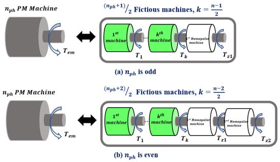 Thus, this formulation makes it possible to transform virtually the multiphase motor to m fictitious machines coupled in series, where each one is associated with a family of odd harmonics. Figure 9 gives the equivalent representation of a multiphase PM motor in the general case of . From this representation, the number of main fictitious and homopolar machines are deduced for the 4 number of phases cases considered in this paper.
