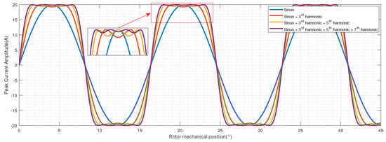 In the case of multiphase winding configuration with , it is possible to consider the current injection containing harmonics. This makes it possible to improve the torque density as well as the reliability of the EM. This characteristic comes from the fact that a multiphase motor voltage vector and output torque in the decoupled plan are given by []:
