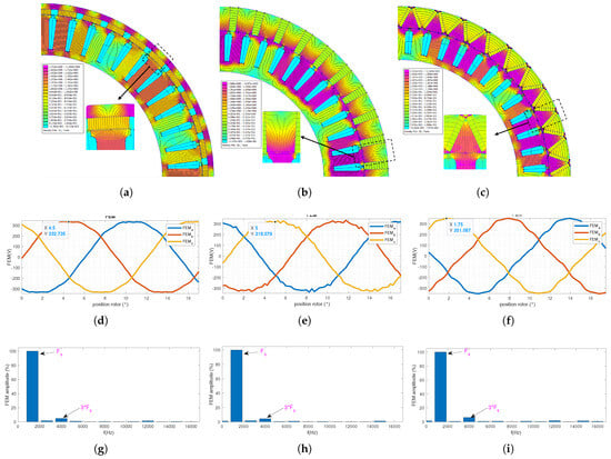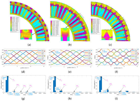 where is the number of slots, p is the number of pair poles, number of EM phases, k is an integer number, and is the great common divisor. The torque cogging and noise level are directly conditioned by the (least common divisor) and of the combination. The larger the value of , the smaller the value of the torque cogging, and the larger the value of the , the smaller the level of noise and the vibration. Furthermore, regarding the integer k, which is also called the key winding factor in [], the higher it is, the more the magneto-motive force (MMF) distribution would contain lower amplitude of higher harmonics which leads to lower torque ripper. The winding factor is also used as an indicator for the combination selection, where the larger it is, the torque density and the efficiency of the motor are improved [,]. In this paper, the following combination is selected for each phase number: 3-phase , 5-phase , 6-phase and 7-phase .