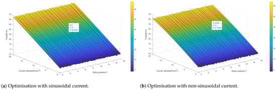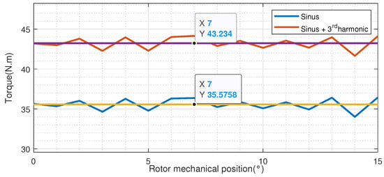 The final step consists of carrying out a global multi-objective optimisation of the EM based on the Direct algorithm as explained in Section 4.2. This optimisation consists of both maximizing and minimizing, respectively, the EM efficiency and the EM weight (kg)) in a single function with the use of weighting coefficients. Constraints on the electromagnetic torque , on the flux density , and on the electromotive force are considered in the optimisation problem as shown in Section 4.1. In the case of multiphase motor configuration, it is possible to consider the injection of currents containing higher harmonics than the fundamental, which results in a compact EM structure with a high torque density. Thus, in this paper, the formulation of the optimisation problem considers two scenarios, a scenario of optimisation with the injection of purely sinus currents and a scenario of optimisation with non-sinus of currents. A new methodology for selecting the optimal current harmonics ratio that allows the creation of torque without the pulsation effect is developed and presented in Section 4.3. The design methodology is enclosed by the analysis and comparison of the EM magnetic and electrical performances.