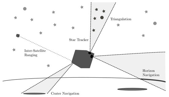 As introduced, five different types of guidance and navigation sensors are evaluated in this work: star tracker, horizon navigation, triangulation, crater navigation, and inter-satellite ranging. Each of the techniques are illustrated in Figure 2.