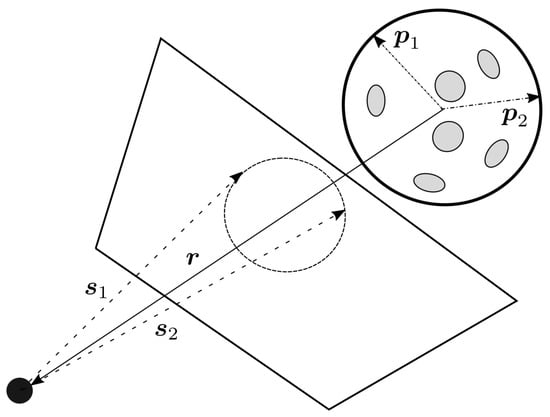 Matrix M describes the shape of the projected ellipsoid on the image sensor, as a function of the ellipsoid matrix A and the observer position . This term is equivalent to the ellipse matrix, as represented in Equation (4), which can be denoted by C, by the following generalised eigen-problem expression,